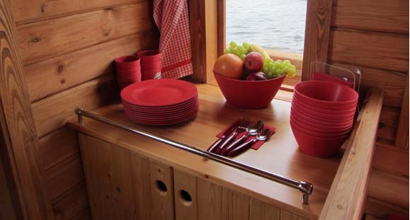 - eine moderne Ausstattung, je nach Boot in den Farben orange, blau, hellgrün oder rot